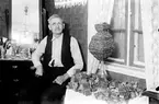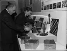 "Finska invalidarbeten på Upsalautställning" - utställningskommissarie Edvin Björklund och C A Andersson i utställningen, Wolraths utställningshall, Uppsala december 1942
