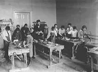 Risbergska skolan, föräldraafton, 15 A 26 maj 1965. Föräldrar beundrar utställning av elevarbeten. Kläder samt trä- och metallarbeten.