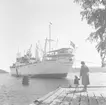 "Nordanland" ligger vid sågverkskajen i Bollstabruk, antagligen för att lasta trävaror. På kajen står fotografen Georg Hedbergs hustru Anna-Lisa med dottern Ulla-Marie. Foto från omkring 1950.