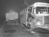Buss, av märket International, har vält efter ett olyckligt möte med en lastbil, som ligger i andra diket. Bussen är skyltad "Till Göteborg". Olyckan skedde den 9/6 1937 ca 100 meter väster om Colldéns i Lindome. Järnvägen syns i bakgrunden. Foto från tidning (HT).