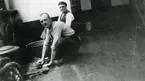 Rosa Krantz (1912 - 1994, gift Pettersson) hänger tvätt utanför föräldrarnas personalbostad på Tulebovägen 23-27 i Stretered, cirka 1935 - 1940. Hon var dotter till skomakare Carl och Nora Krantz, båda anställda på Stretereds skolhem. Rosa gifte sig senare med skräddaren Bror Pettersson. Originalfotot skadat efter en brand cirka 1945-1946 då makarna Pettersson hyrde en lägenhet i villa "Ljusbo", Kyrkbacken.