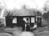 Familjen Andersson framför Älmekulla i Västra Ryd. Rimligtvis är det makarna Anders August Andersson och Josefina Olivia Johansson som står framför ingånen till verandan. Tiden är omkring 1915.