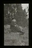 Elin Morthensen (född Anrep) sitter på en stock i skogen. Vitsippor blommar på marken.
