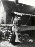 Fotot gåva av Ingeborg Hellberg Torggatan 6 D 311 31 Falkenberg, den 7 nov 1989. De boende i kv. Svärdet 5 uppställda utanför bostadshuset 1921. Fr.v. Erik Hjalman (på motorcykeln), Ingeborg Kronvall, Britta Kronvall, uppgift saknas, Per-Harry Kjellberg, skräddare Emil Svensson (hyresgäst) och hans hustru Alma (sömerska), Karl Kronvall och hans hustru Hilma, Amanda Kronvall och hennes mor Lena-Beata, Potensia Persson (trotjänarinna hos Kronvalls)