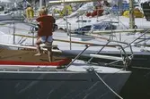 Interiör, pentry och salong i Albin 78 Cirrus. Konstruktören Peter Norlin tittar på ett sjökort.