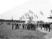 Officerare och manskap under stridsövning med gasmask. Andra bilder i Bergers samling tyder på att detta fotografi tagits vid landstigningsövningen på Stabbo i Stockholms södra skärgård 1929.