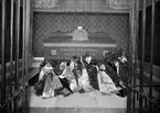 "Sex praktfulla lagerkransar nedlades på lördagen under enkla men stämningsfulla former vid Emanuel Swedenborgs sarkofag" i Uppsala domkyrka