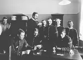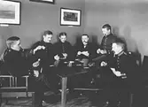 Fem män sitter runt ett fyrkantig bord i ett rum och spelar kort. Mannen till vänster är möjligen S Miller. På väggen bakom dem skymtar en karta över Europa.