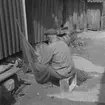 Wilhelm reder skötar i gistgården framför Söderhälls äppleträd.