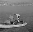 Enligt fotografens notering: "Trålbinderi på Smögen. t.v. Holger Johansson, Nanda Smögen".