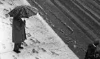 Vårregn, 31 januari 1966 Två damer klädda i mörka kappor, knytskor och handväskor hängamde på armarna samt med paraplyer i händerna går trottoaren fram i centrala Örebro.