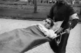 "Karantänsförläggning" på Kvarnbyskolan för flyktingar från koncentrationsläger i Tyskland 1945. En manlig flykting på bår buren av en Röda Kors-personal.