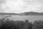 Älvbåt med råsegel går ut på Vassbotten, Vänersborg. Enligt muntlig uppgift kan detta möjligtvis vara älvbåten "Herman". Byggnaden i bakgrunden tillhörde järnvägsbolaget.