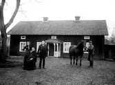EN MAN OCH TVÅ KVINNOR UTANFÖR BOSTADSHUS.
