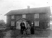 Sluss- o brovakt Gustav Larsson med hustru Maria och barnen Arvid, Olga, Gerd och Signe framför sin bostad 1916.
