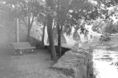 Text på baksidan av fotografiet.Vy från "Doktors- promenaden" Falkenberg, vid Garvareforsen- slänten. Byggnaden i mitten med bottenvåningen av sten är en kopparslagareverkstad enligt byggnadslov 1890-04-29 och ansökan om brandförsäkring 1893-08-22. Byggnaderna väster därom liksom verkstaden har legat på tomten nr 2 enligt beteckningarna 1808-1921 och sedan stg 945 (t.o.m. 1986-10-15). Verkstaden och byggnaden bakom låg vid en "Vattengränd" mellan Storgatan och Ätran. Norr om denna gränd låg tomten nr 1, numera Smeden 8, m.fl., vilka delvis synes till höger om kopparslagareverkstaden. Byggnaderna på tomten nr 2 låg kvar åtminstone till 1940 och är med på 1913 års karta ( men ej 1954). Staden förvärvade tomten 1940-11-19 och sålde 34 kvm 1941-06-17 att ingå i Smeden 8 en ligt tomtindelningen fastställd 1940-06-04 och stadsplan fastställd 1939-01-13. Falkenberg 1996-12-03 Carl Estmar.