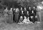 Enligt medföljande text: "Utanför stora salongen på Backamo. Frv bla: Disp Carlander Munkedalsbruk, Major Zetterberg, Moster Anna Wallgren, Kapten NattoDag, fru Carlander, Pastor Flodin, häradshövding Ursel (kusin till morfar)".