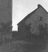 Vy över snöklädd bygd med fattighuset och plitaskomakarns hus till höger. I bakgrunden syns Låstads kyrka.