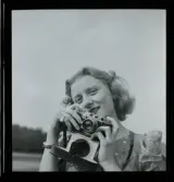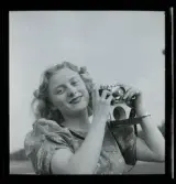 Kvinna med filmkamera. Retuscherad reklambild, Nordiska Kompaniet, NK.