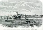"Utsigt af Mariestad, de svenska landtmännens mötesplats i augusti 1874. Tecknad af R. Haglund." Ur Ny Illustrerad Tidning, 1874.
