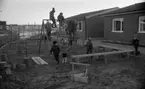 Snögrottor, 4 december 1965. Man varnar för 'farliga snögrottor' i snöhögarna från snöplogarna. Här bygger barnen en snöfästning på stora cementrör på en fyrkantig innergård omgiven av hyreshus. I bakgrunden snötäckta gungor.