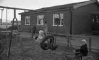 Lekplatserna tråkiga 7 juli 1965 En liten flicka på lekplats i bostadsområde. Hon kikar genom botten på gungan. En docka sitter på gungan. En korg ligger på marken. I bakgrunden syns radhus samt en midsommarstång.