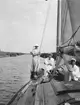 Vy från Djurgården (strax öster om Djurgårdsbrunnsbron) åt öster mot Djurgårdsbrunnskanalen. Rundtursbåt på väg mot Lilla Sjötullen.