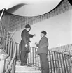 Chefen för Karlskronavarvet håller ett tal under en middag efter sjösättningen av T136 Västervik. Stående är Karlskronavarvets VD Johan Söderman, till höger sitter marinchefen, viceamiral Bengt Lundvall.