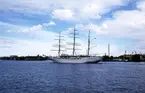 Rederi Sveas nya kryssningsfartyg S/S Birger Jarl på sin jungfrutur vid Norrström.