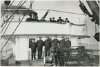 Stockholm. Vy från Skeppsholmen med två matroser i förgrunden, passagerarfartyg vid Skeppsbrokajen med Kungliga slottet i bakgrunden.
