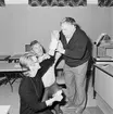 I fritidslokalerna i posthusets femte våning är överpostiljon Folke Strandner, t.h., lärare. I lektionssalen finns fack för fingerade brevbäringsdistrikt, där finns försändelser av olika slag, fastighetsböcker och blanketter, som eleverna får öva med.