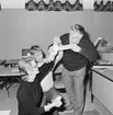Stureskolan invigs. Kvinnor och kostymklädda herrar i köksmiljö. Kanske lektionssalen för hemkunskap. Här finns små bord med dukar på och en spis skymtar.