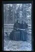 Kabinettsfotografi: ett äldre par. Kvinnan sitter på en stol vid ett litet runt bord där det ligger en bok. En man står bakom henne.