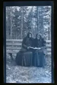 "Tora Samuelsson, Elsa Råstedt, leker gamla gummor" Två utklädda kvinnor sitter utomhus på en bänk och läser i en bok.