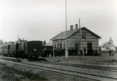 Flygfoto över stationen Station anlagd 1889. Envånings putsad stationsbyggnad
