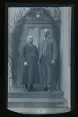 "Axels far och mor." Porträtt av fotografens föräldrar, Fredrik Vilhelm Eriksson (f.1854) och Anna Maria Larsdotter (f.1856) ståendes framför en lövad dörr. Någon fyller 85 år.