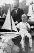 En besättningsmän från Albatross presenterar en modellbåt från den tyska minkryssaren som enligt påskrift skänktes till Drottningen av Sverige.