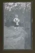 "Strömkärr" En liten pojke står på en stor sten. Han håller i en nalle.