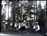 "Husmodersskolan". Kvinnor pojke och flicka i nationaldräkter fikar i i skogen.