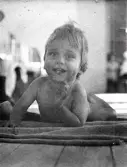 "Lilla Rugge". En liten pojke ligger på en filt på golvet. Dålig bildkvalitet!