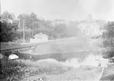 Spårsida med lokstall och bebyggelse i bakgrunden.