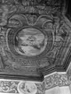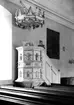 Del av skåp, sniderier och måleri. Ett beslag syns i bild.