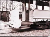 Se under anm. 1997:3485. Under bilden står "Den nya spårvagnen". Det var det första året spårvagnar gick som inte hade uteplats fram och bak som de äldre vagnarna hade. Karl sprang ut från sitt arbete på tryckeriet för att ta kortet.Tryckeriet flyttade till lokaler på Göteborgsvägen 1938.