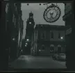 585/40 Facit Nattbild från N.K + Södra Kungstornet. Kvällsbild. Facit-skylt på taket av fastigheten Styrpinnen 22, ritad av arkitekt Ivar Tengbom i hörnet Hamngatan / Kungsträdgårdsgatan i Stockholm.