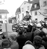 Drottninggatan 71B, Norra Latin. Privatistexamen. Inger Gerdén sätter en stor studentmössa på nybakade studenten Arne Erikssons huvud.
