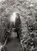 Hasselfors bruk 19 augusti 1965 En tonårspojke, en kvinna och en man står till vänster på bilden. De arbetar i trädgården på Hasselfors bruk. En spade samt en skottkärra syns på bilden. En massa trälådor syns med odlingar i. Träd syns i bakgrunden.