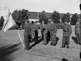 Regementet i förbimarsch för sekundchefen från soldathemmet tillbaka till kasern efter korum. Aspirantskolan med avdelningschef och skolans underbefäl från olika regementen i täten.