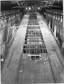Jagaren UPPLAND på provtur på västkusten. Vy akteröver med 12 cm kanoner, sjunkbomsfällare och örlogsflagga.