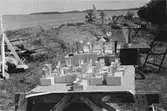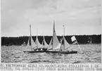 Det segrande laget från Saltsjöbadens Samskola som 3 juli 1932 under Österskärsregattan hemförde Oscar Holtermanns vandringspris, se KSSS årsbok 1933 s 116 ff och s 156 f. I laget ingick Lennart Blom (f. 1915), Bengt Folke (b. 1919), Sven Nicou (f. 1918) och Gunnar Blom (f. 1916), vem som är vem på bilden är inte bekant. Fotografiet återgivet i a a s 117. Bakom pojkarna t v skymtar ordföranden i KSSS volontäravdelning, Carl Matthiessen.