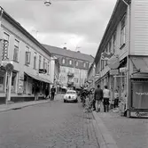 Skaragatan i Kvänum. ............ Pappershandel, Skara Färgeri, Carl Liefgren, köper ull o stickylle, säljer garn, tyger, filtar, emottager ... Albert Berg, Skrädderiaffär Agnes Petterssons Mode o Manufakturaffär.